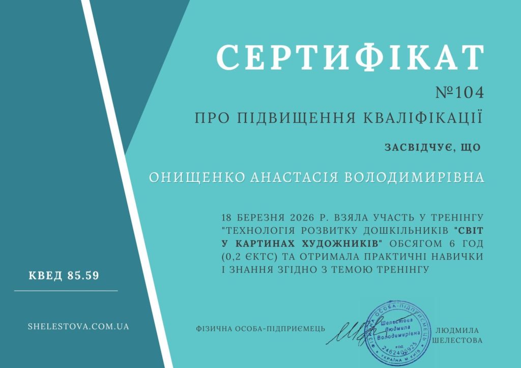 У ДНЗ «Росинка» м. Вишневе Київської області 18.03.2026 відбувся практичний тренінг для вихователів, присвячений роботі з альбомом «Світ у картинах художників».